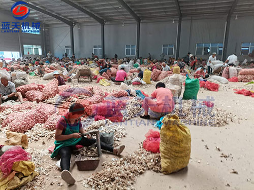 工人們先把蒜蒂去除,去除的大蒜通過傳送帶送往機器中剝皮,分瓣、切片